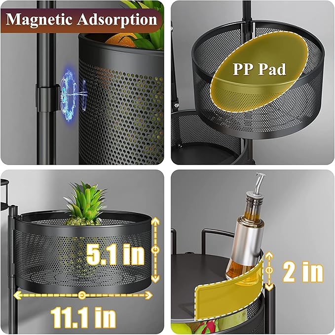 ✔ 360° rotating baskets – Each tier spins independently for easy access to stored items.